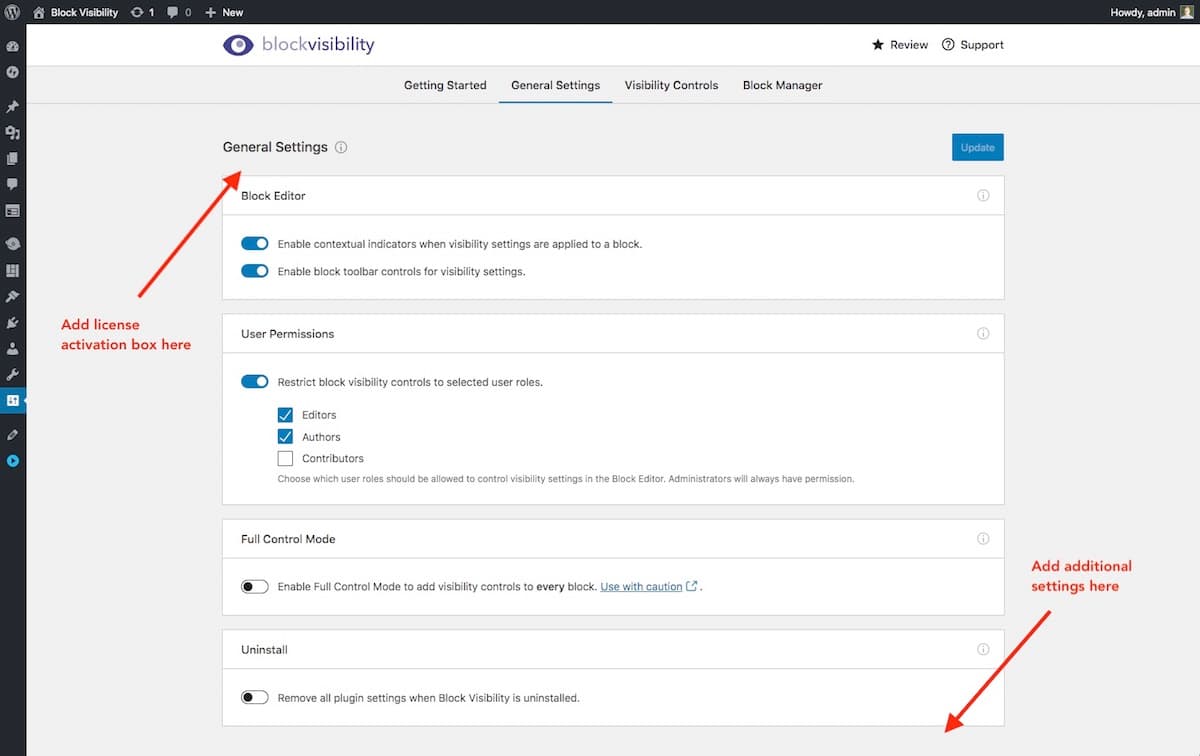 I will be using SlotFill, so the settings page needs to have a Slot at the top and bottom. The license activation box would be placed in a Fill for the top Slot. The other settings would be placed in a Fill for the bottom Slot.