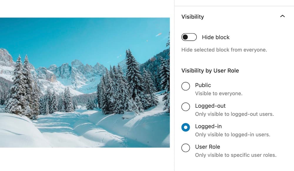 Block Visibility adds a "Visibility" panel to each block in the Block Editor. Simply toggle the content to "Logged-in" and it's now only visible to logged-in team members. When the content is ready to go, just toggle it back to "Public" and voilà!