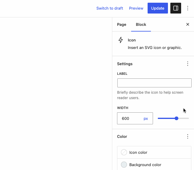 Last month, I updated the block inspector panel in Block Visibility with a similar implementation. Much of what I learned there was easily applied to the Icon Block. The icon label and width settings are defaults, and the new height control can be added from the options menu.