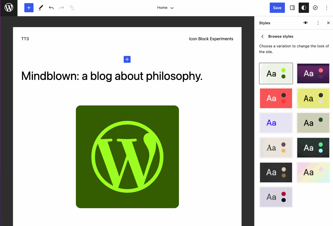 Here's a look at style variation switching in action using the Twenty Twenty-Three theme. Icon color and background color are set to primary and secondary respectively.