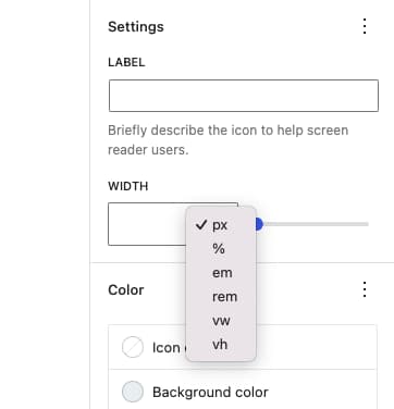 After numerous feature requests, version 1.4.0 introduces a new icon width control that supports %, px, em, rem, vh, vw, or whatever set of units is defined in theme.json.